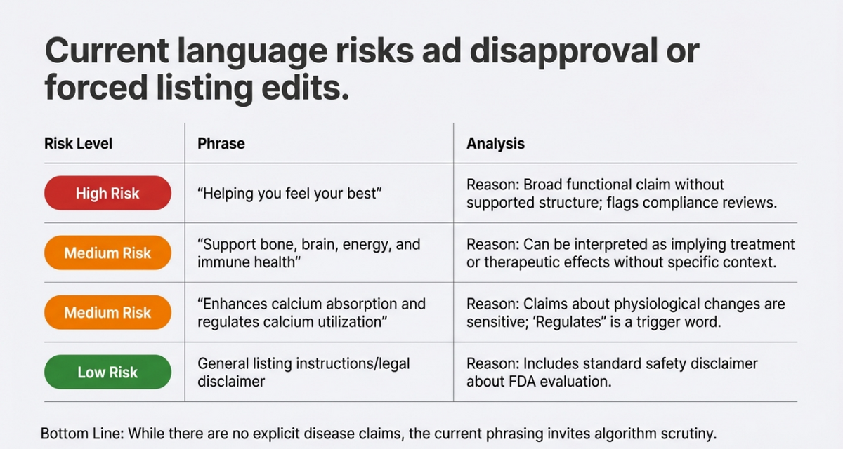 I've spent years analyzing Amazon listings for supplement brands, identifying the patterns that separate top performers from struggling products. This audit exists because most brands don't realize their listing has compliance risk or conversion blockers until it's too late. My approach is diagnostic, not promotional - I tell you what I see, backed by data and category expertise. No hype. No growth promises. Just honest analysis of where your listing stands and what might need attention.
